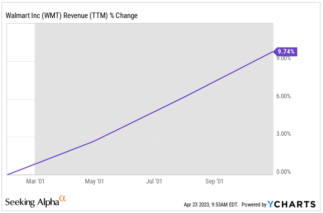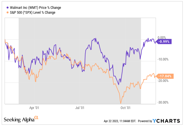 In 2001, WMT’s stock stayed flat while the S&P 500 index went down by 17%.