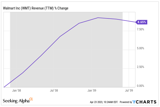 I think that WMT’s tactical approach and solid financial standing will allow WMT to outperform during a recession. Furthermore, I expect that WMT’s focus on affordable pricing, everyday value, private label brands, and digital commerce platforms to draw cost-aware customers aiming to cut expenses amid tough economic conditions. In fact, WMT’s sales increased by 8.7% during the 2008 recession, while other retailers struggled.