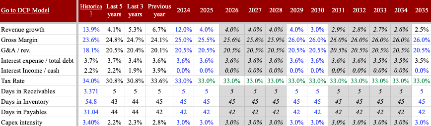 As for margins, I expect a modest improvement as most efficiency gains will likely be passed on to customers through lower prices, which in turn supports revenue growth. Here are the key assumptions I used: