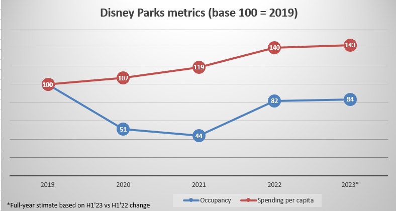 While the media segment looks unstable, Disney has always had a stable footing. Of course, I am talking about Parks. Theme park segment revenues reached pre-COVID levels at the start of fiscal 2022 and have remained strong since then. Since restrictions have been lifted, the number of tourists hasn’t fully recovered but average spending per visitor is now 40% above pre-crisis levels.