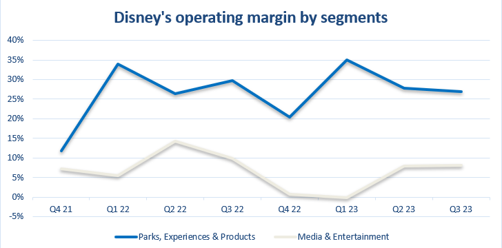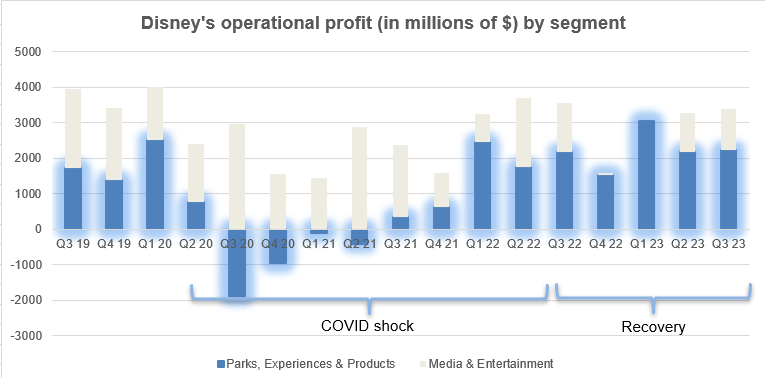 In the post-Covid period, the Parks, Entertainment & Products (PE&P) segment has been the main thing keeping the company afloat. It is generating only 37% of revenues, but over 66% of total operating profits.