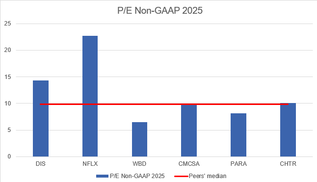 However, the stock is still at 9-year lows despite industry outperformance this year. So are the valuations. If we look at the median forward 2025 P/E among Disney’s industry peers, Disney looks expensive.