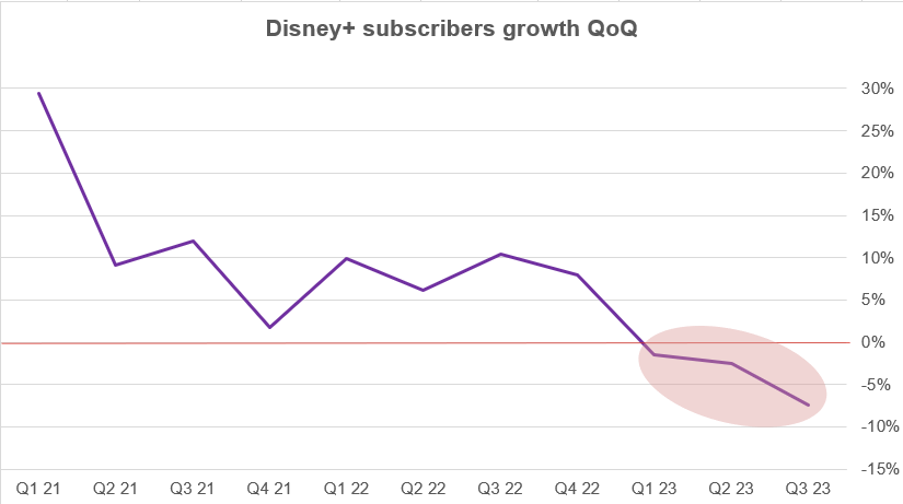 In 2023, Disney has been facing a slowdown in its streaming business. The company’s key service, Disney+’s subscribers decreased in the three last consecutive quarters.