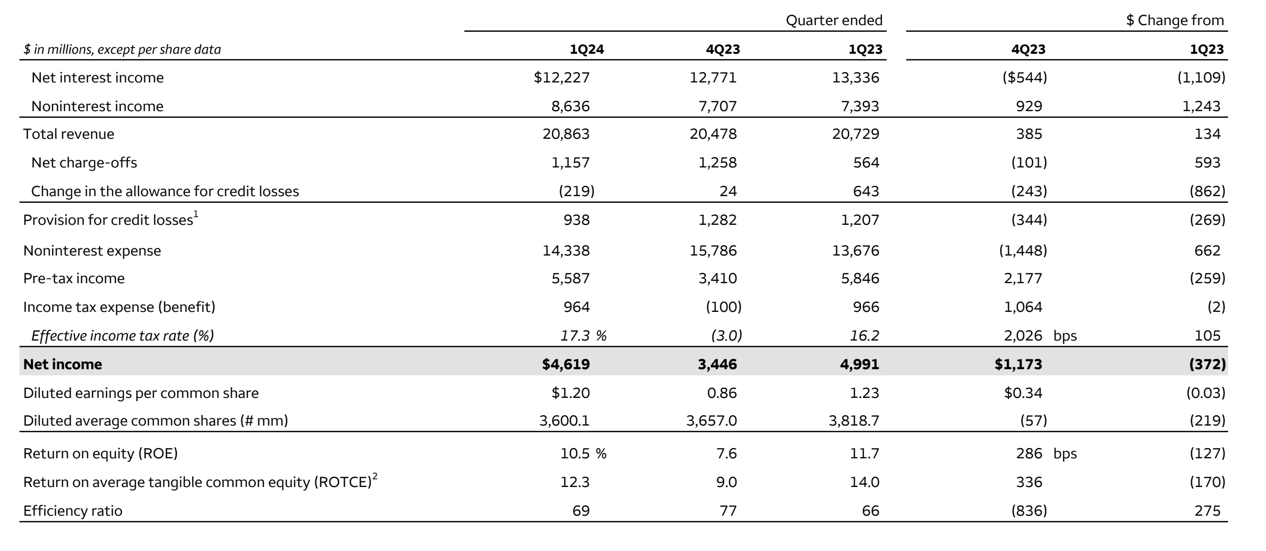 - The company had strong 1Q earnings, with revenue increasing and net income of $4.6 billion, resulting in a low P/E ratio of ~13.