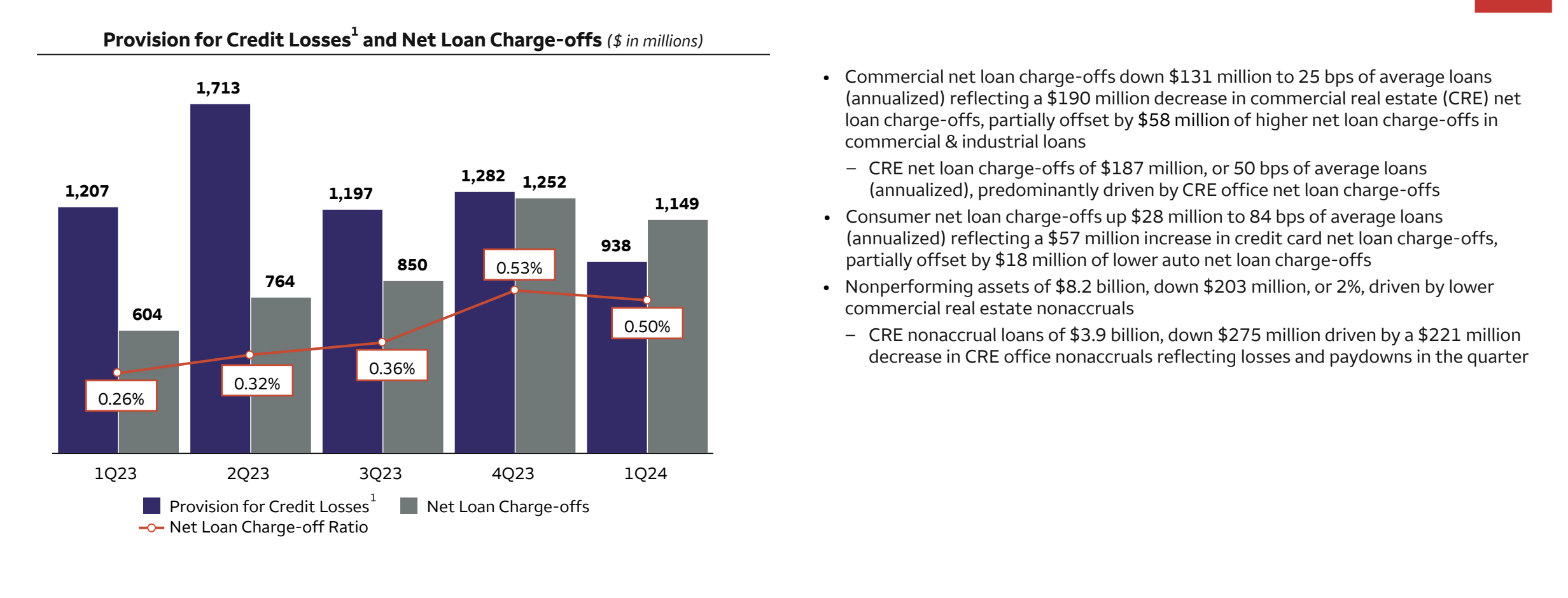 The company saw $1.15 billion in net loan charge-offs for the quarter, with a $940 million provision. The company’s net loan charge-off ratio was 0.5%, a relatively low level, especially in a high-interest rate market. So far, the market shows no substantial weakness from higher interest rates, and we’re hoping that that can continue.