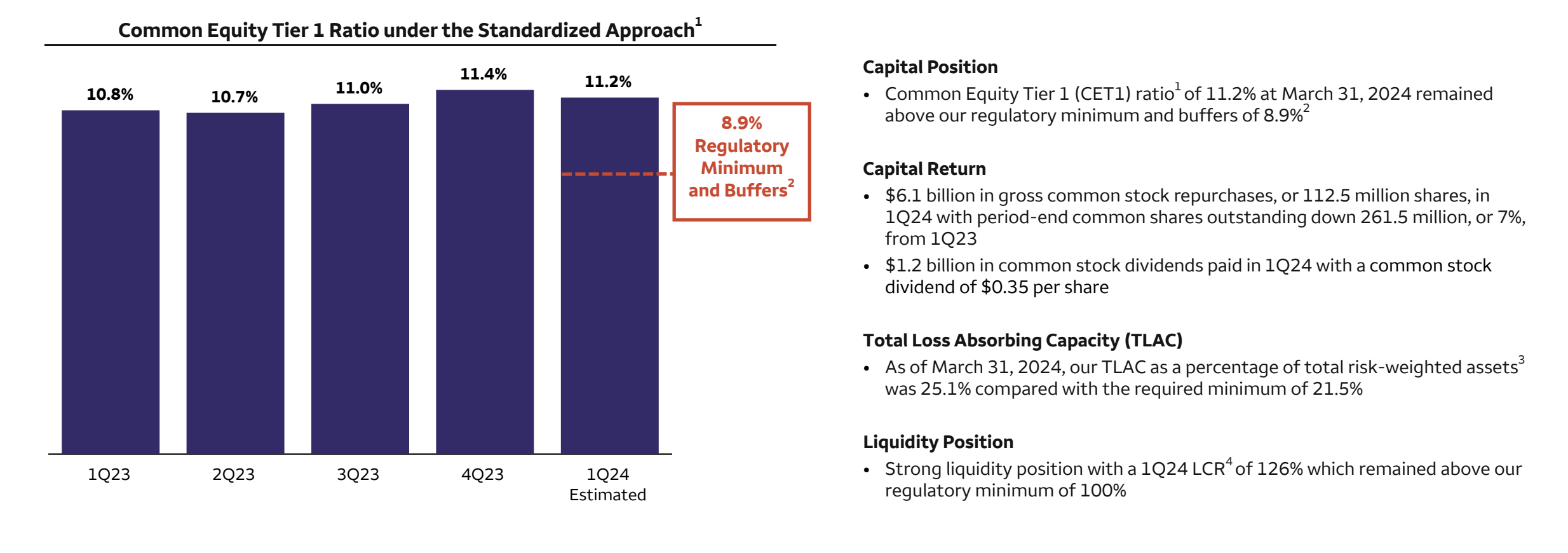 The company has an 11.2% Common Equity Tier 1 ratio, well above regulatory minimum buffers. That enables continued substantial shareholder returns, the company repurchased a massive $6.1 billion of common stock in the 1Q leading to maintaining its dividend of 2.3% along with an annualized repurchasing rate of 12%.