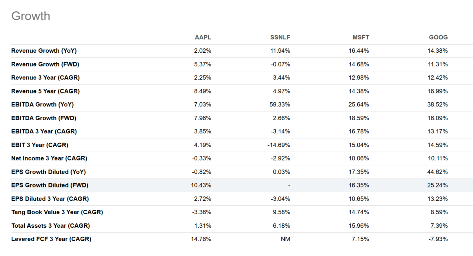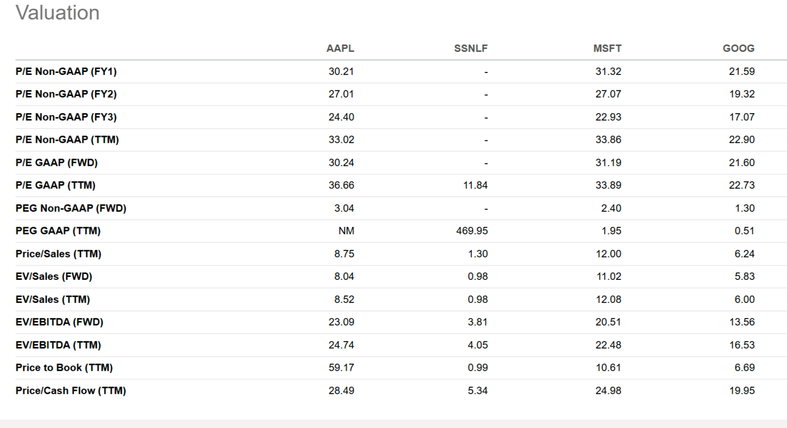 Apple doesn’t really have a comp like a car company has or a construction company. I pulled up the valuation data for Samsung (OTCPK:SSNLF), Microsoft (MSFT) and Alphabet (GOOG) because these companies are huge and definitely share important characteristics as well as compete with Apple.