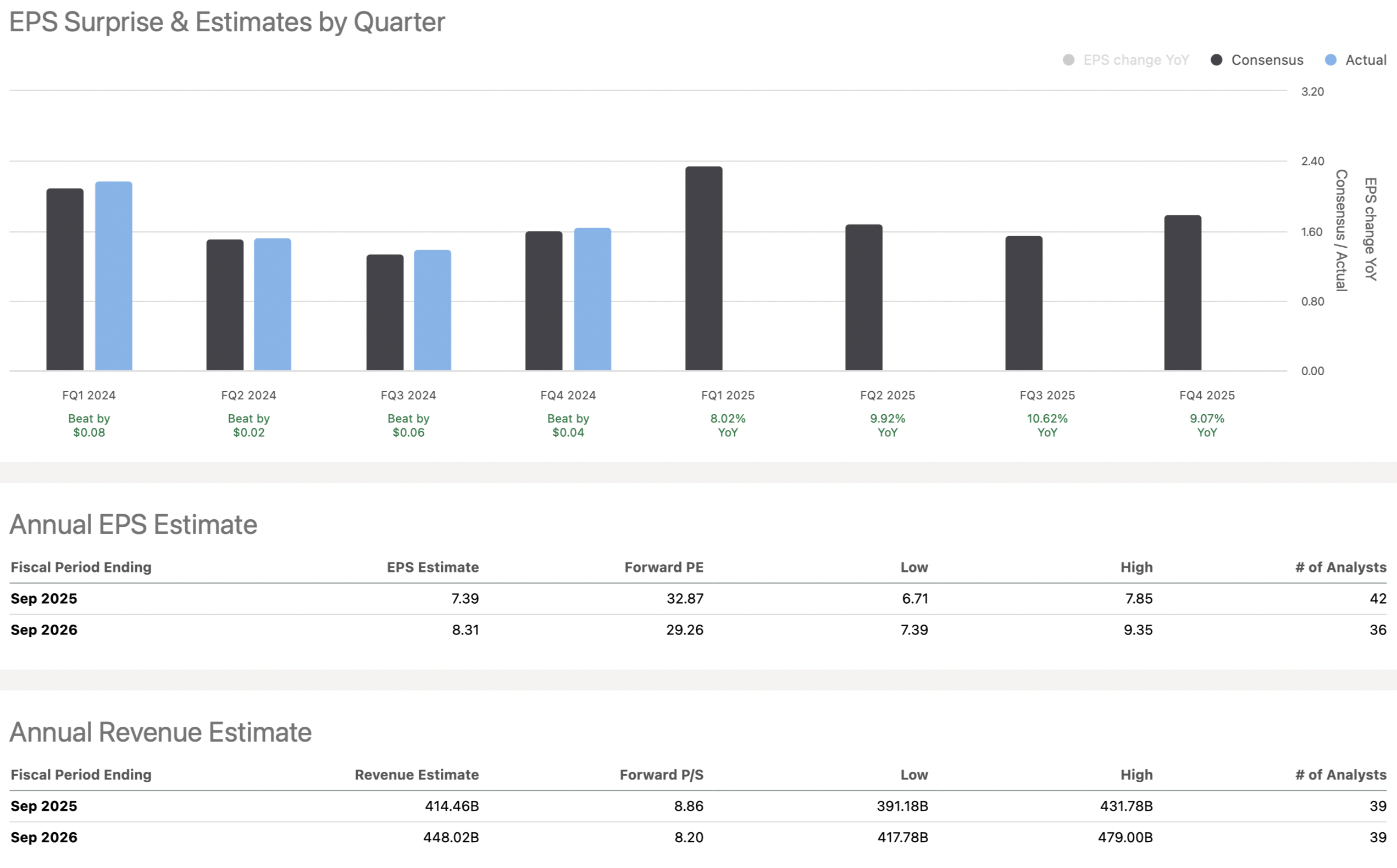 Apple could deliver EPS of about $7.40 in 2025, putting its forward P/E ratio above 32. If we look forward to the following year’s (2026) $8.31 in EPS, Apple still trades at a relatively high 29-30 forward P/E ratio. Even if we factor in a minor outperformance Apple could achieve, its forward P/E ratio is still around 28-29, which is relatively high for a company in Apple’s position.
