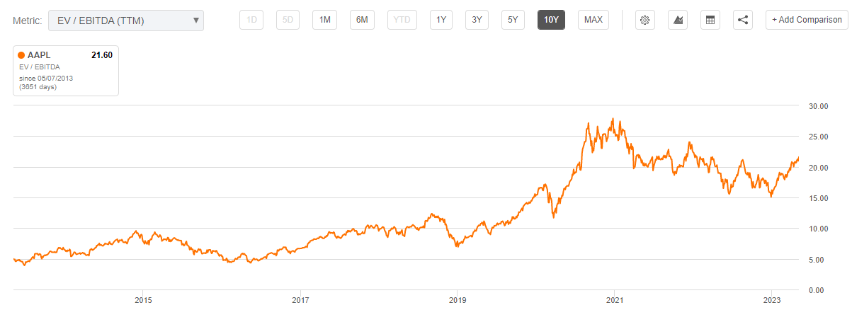 Berkshire Hathaway identified Apple’s outstanding ROIC performance as far back as 2016, making it one of the company’s most successful investments to date. Despite the premium ROIC that Apple has delivered over the past few decades, one might assume that the multiple an investor would have had to pay was prohibitively high. However, a closer look at Apple’s valuation at the time reveals just how undervalued it was. In 2016, the EV/EBITDA ratio for Apple was just 5, while the average for the S&P 500 (SP500) was well above 10 during the same period. As a result, Berkshire was able to acquire a large company that generated exceptional ROIC at a remarkably cheap multiple, delivering significant value to its shareholders.