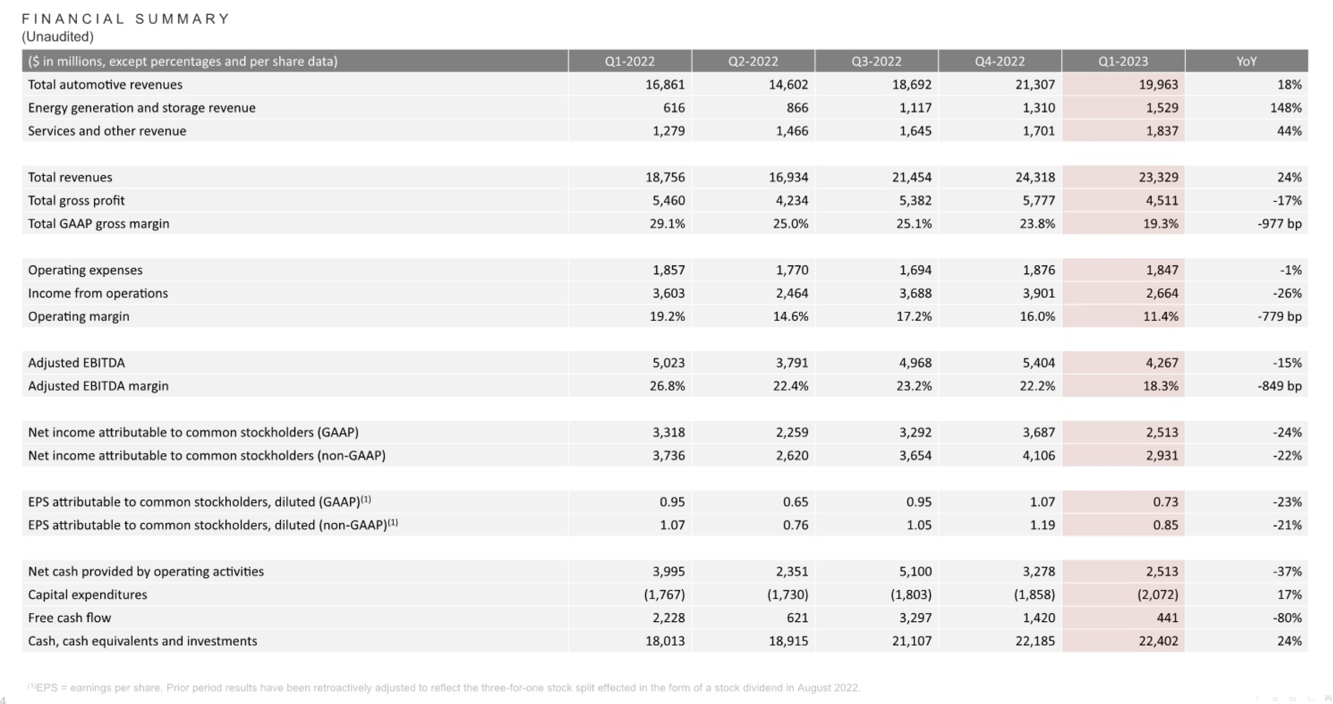 Talk about an overreaction: Tesla’s stock is down by 10% in pre-market, primarily due to a revenue miss of $60 million in Q1. The company still delivered $23.3 billion in revenues, a significant 24% YoY gain. Moreover, Tesla topped delivery expectations with 422,875 vehicles sold in Q1—Tesla’s non-GAAP income of $0.85 came in line with analysts’ estimates. Also, we know that the revenue miss occurred because of a strategic decision to lower prices to spur demand in the current challenging economic environment. This dynamic enabled Tesla to continue growing its customer base while taking market share from its less profitable EV-producing competitors.