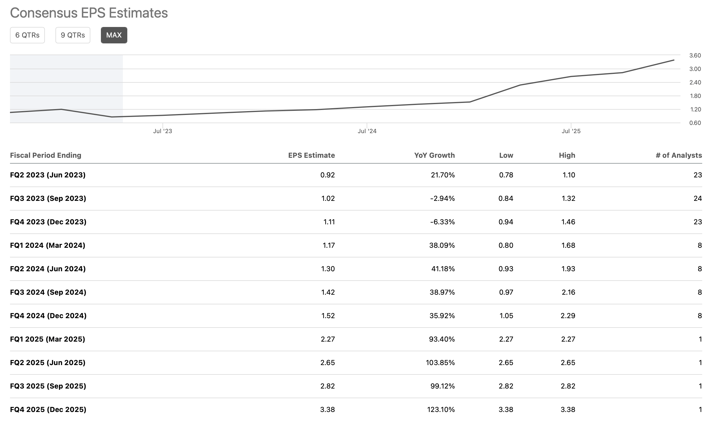 We know that Tesla faces a temporary earnings decline due to the challenging macroeconomic environment, temporary price cuts, and other transitory factors. Therefore, we could see a quarterly EPS trend around $1-$2 in 2023-2024. However, Tesla’s EPS growth should continue, and the company could earn around $3-$4 per quarter in 2025. If we use a mid-range estimate of $3.50, splitting it over four quarters would provide Tesla with an annual EPS of about $14 in 2025. Even if the company earns $13, the lower range of my estimates, it’s trading below 13 times 2025 estimates now.