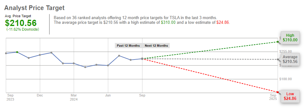 Analysts confirm the uncertainty. If we look at the next 12-month analysts’ price targets for Tesla, the range is broad. Some analysts forecast a price as high as $310/share, while the average is around $210. This, in fact, presents a roughly 11% downside from today’s share price of $238/share.