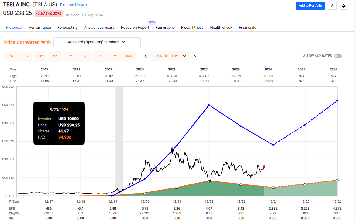 Putting a fair valuation on Tesla’s stock is a daunting task. The shares have historically been very volatile, with the valuation fluctuating from 30x its earnings to 340x in the past five years alone, as the growth prospects for the future varied massively.