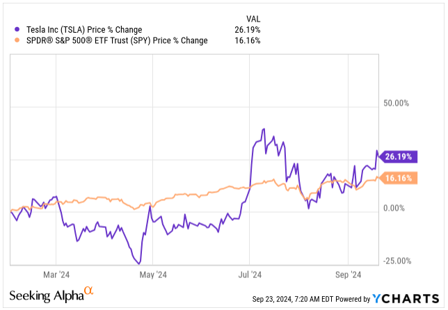 Since my last coverage, when I rated the stock as a “Hold,” the company has outperformed the S&P 500 (SP500) by a margin of 10%. Excessive optimism about its “Robotaxi” event, expected to take place in October, is driving the stock once again to dizzy valuation highs.