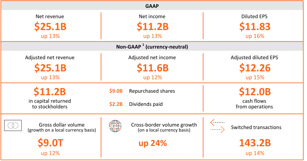 We see that the company earned $25.1 billion in net revenue, which turns into a $11.2 billion net income. The company was able to generate $12 billion in operating cash and returned to its shareholders over $11 billion.