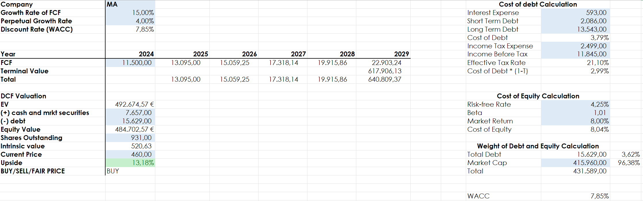 Mastercard is expensive, as we have seen. However, if we look at its compounding strength, I still find it a company offering very decent value, if not a true opportunity. I assume Mastercard can grow its FCF by 15% for the next 5 years and then use a 4% perpetual growth rate (I doubt that in 5 years Mastercard will grow its FCF at 4% annually). The market expected return is 8% and Mastercard’s WACC is calculated to be 7.85%, which I also use as my discount rate. Considering this year Mastercard is expected to report $11.5 billion in FCF (I actually expect $12 billion, but I wanted to be a bit conservative), I found out that Mastercard’s fair value is $520.