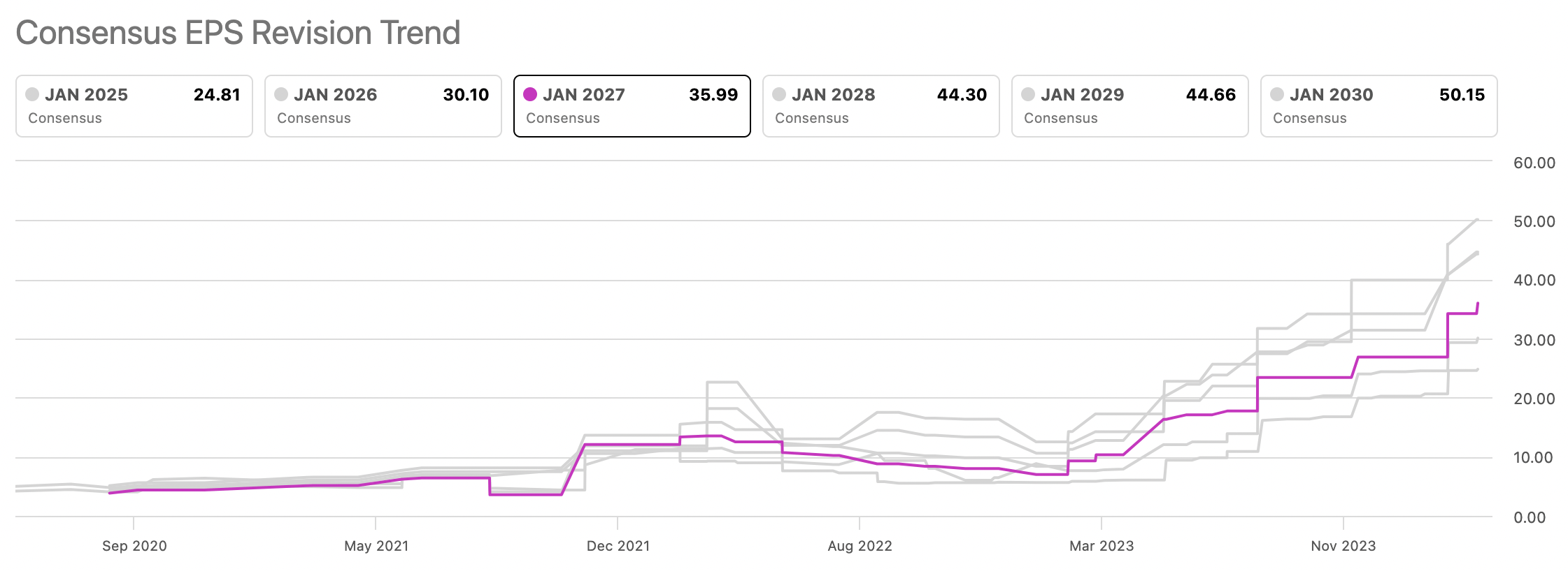 As much as they completely underestimated the upside potential of AI, they are now potentially overestimating it by projecting $33 in EPS for 2027.