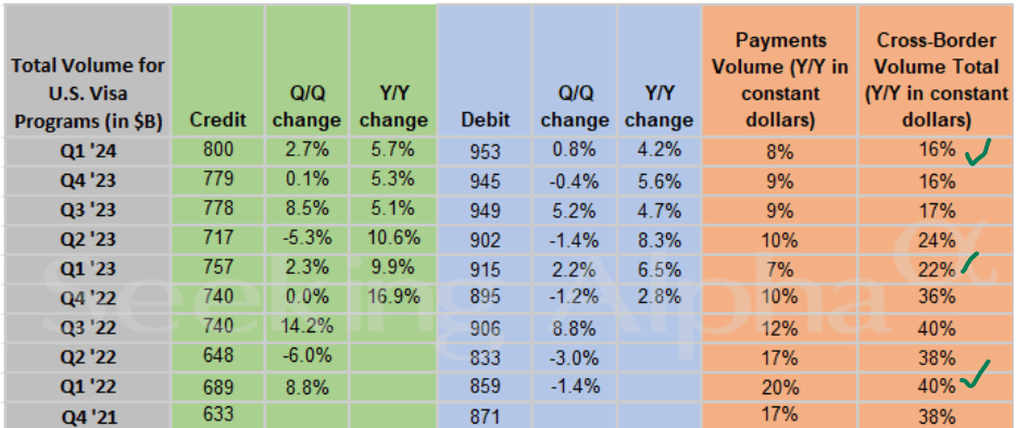 Readers who zoom out beyond last year will see that Visa’s payment volume is dramatically lower than in Q1/2022. As shown in Visa in the charts below, growth is less than half of 2022’s levels of 40%: