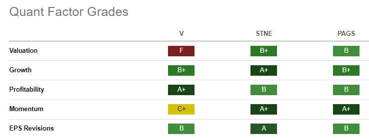 Readers may compare Visa’s Prosa acquisition to a pair of companies. First, StoneCo (STNE), a fintech that enables small businesses is based in Brazil. Second, PagSeguro (PAGS), also based in Brazil, offers payment processing software. StoneCo has one of the highest Quant scores on Seeking Alpha.
