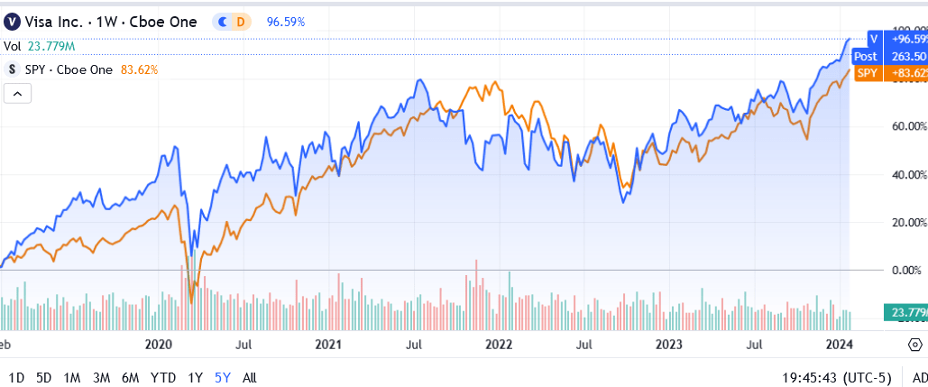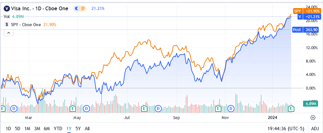 This is an unfair comparison because the economy benefited from very loose credit conditions, low inflation, and low interest rates. Most importantly, V stock is up from 2021-2022 levels.