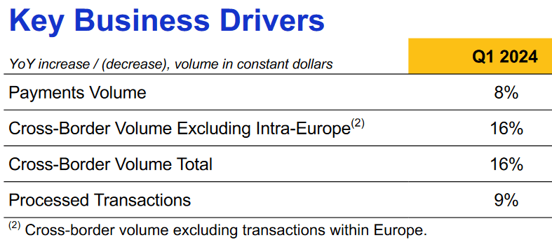 It reported growth in the high single-digit percentage for payments volume and processed transactions at 8% and 9%, respectively. Visa posted commanding strength in cross-border volumes: