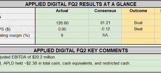 Applied Digital press release (APLD): Q2 Non-GAAP EPS of $0.00 beats by $0.21. Revenue of $126.59M (+98.2% Y/Y) beats by...