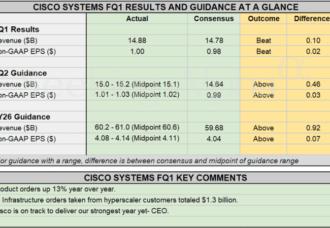 Cisco Systems press release (CSCO): Q1 Non-GAAP EPS of $1.00 beats by $0.02. Revenue of $14.88B (+7.5% Y/Y) beats by $100M....