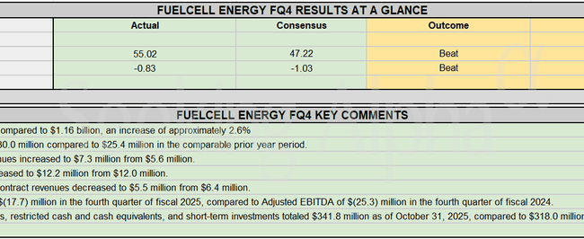 FuelCell Energy press release (FCEL): Q4 Non-GAAP EPS of -$0.83 beats by $0.20. Revenue of $55M (+11.6% Y/Y) beats by...