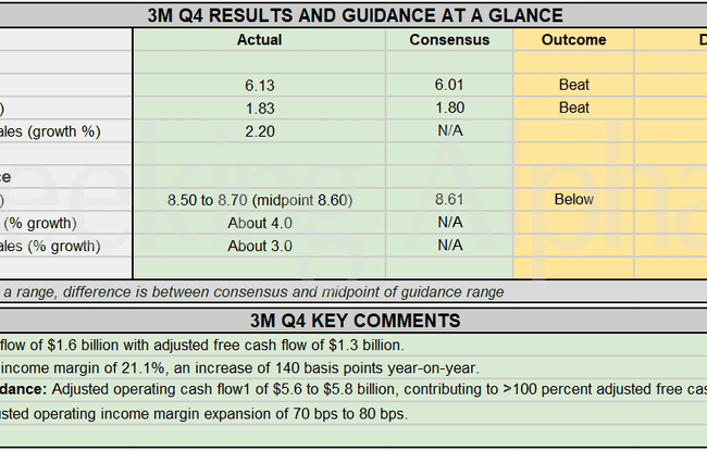 3M press release (MMM): Q4 Non-GAAP EPS of $1.83 beats by $0.03. Revenue of $6B (+2.1% Y/Y) misses by $10M. 3M provided the...