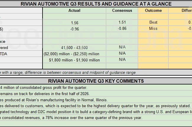 Rivian press release (RIVN): Q3 GAAP EPS of -$0.96 misses by $0.10. Revenue of $1.56B (+78% Y/Y) beats by $50M. $1,142...