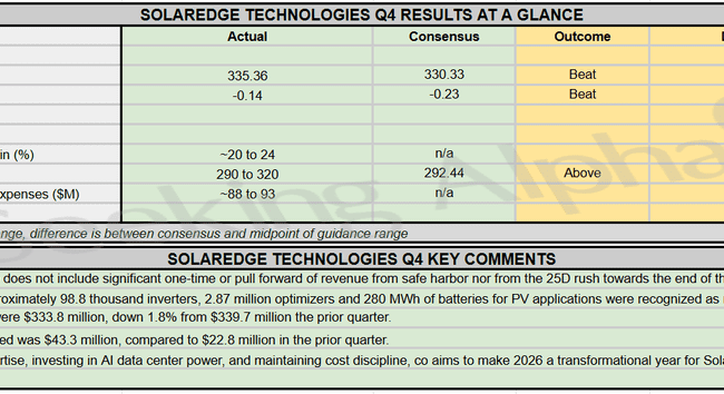 SolarEdge Technologies press release (SEDG): Q4 Non-GAAP EPS of -$0.14 beats by $0.09. Revenue of $335.36M (+70.9% Y/Y)...