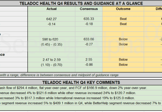 Teladoc Health press release (TDOC): Q4 GAAP EPS of -$0.14 beats by $0.04. Revenue of $642.27M (+0.3% Y/Y) beats by $6.94M....