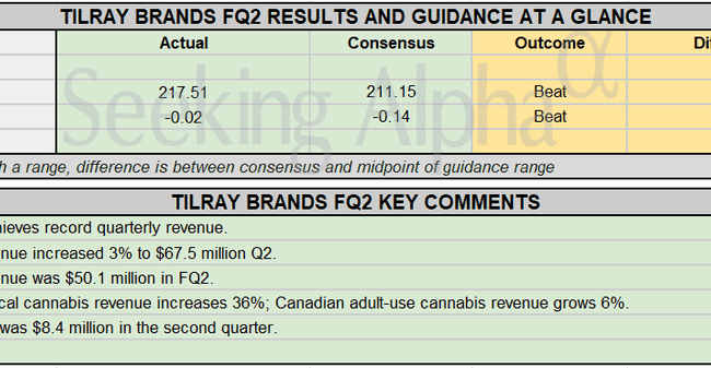 Tilray press release (TLRY): Q2 Non-GAAP EPS of -$0.02. Revenue of $217.51M (+3.1% Y/Y) beats by $6.36M. Cannabis net...